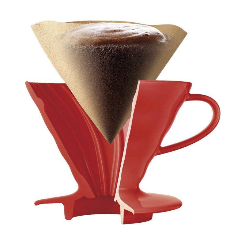 Maailmakuulus filtermeetod Hario V60. Koonusekujuline filter lisab kohvipurule sügavust, nii et vesi püsib kohviga pikemalt kontaktis ja saab sealt kaasa rohkem maitseid. Koonus on mõeldud 1-2 tassi valmistamiseks. Punane keraamiline. Kasutamiseks läheb vaja ka 01 suurusega koonuselisi filtreid.